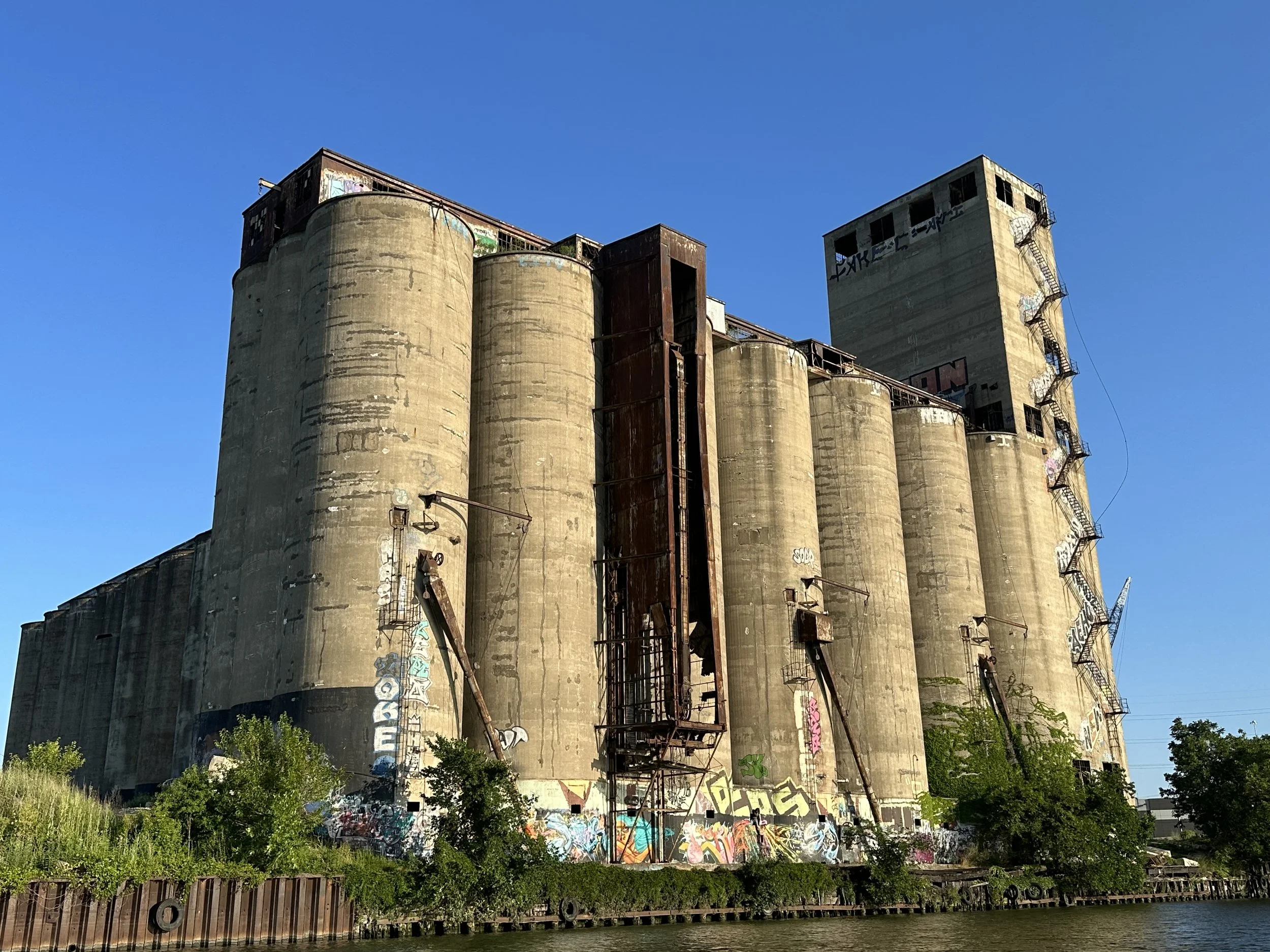 A slice of the silo at the southeastern edge is missing, and cracks appear in the wall directly on the riverfront. Now that barges have left the Santa Fe Slip, bricks and debris in the outlets under the former red brick building are visible. Dead fish from the previous week’s combined sewer overflow have been removed.